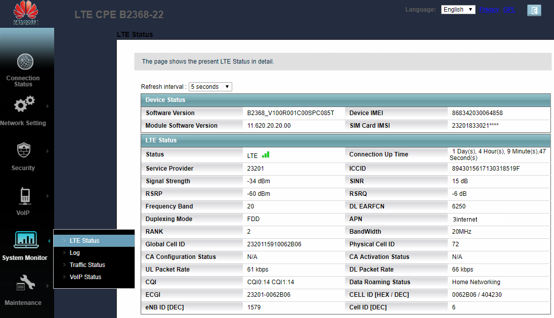 | 24-Apr-2019 | Huawei "Hi Link" app does not yet recognize this model, but B2368 does support remote access (HTTPS) and local access, and records data usage. | |
