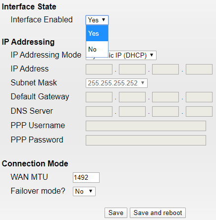 - Select WAN connection setup (Ethernet 2): set Interface Enabled to Yes [click Save and reboot]