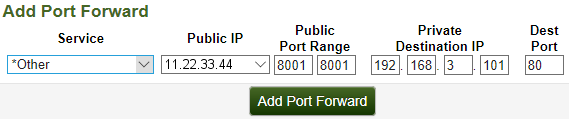 You may want to use different public port numbers that are forwarded to the same port on different IP devices on the LAN. Consider this example where there are 3devices on the LAN which have Web GUI on port 80:- Port forward public ip 11.22.33.44:8001 > LAN IP 192.168.3.101:80