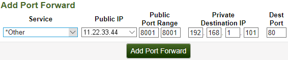 You may want to use different public port numbers that are forwarded to the same port on different IP devices on the LAN. Consider this example where there are 3 devices on the LAN which have Web GUI on port 80:- Port forward public ip 11.22.33.44:8001 > LAN IP 192.168.1.101:80