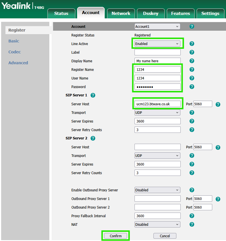 Enter the IP address of the Yealink phone into a web browser and log in as admin (change the admin password "admin" as advised above if not already secure). Navigate to Account [menu] > Register [sub-menu] > (enter the account fields)