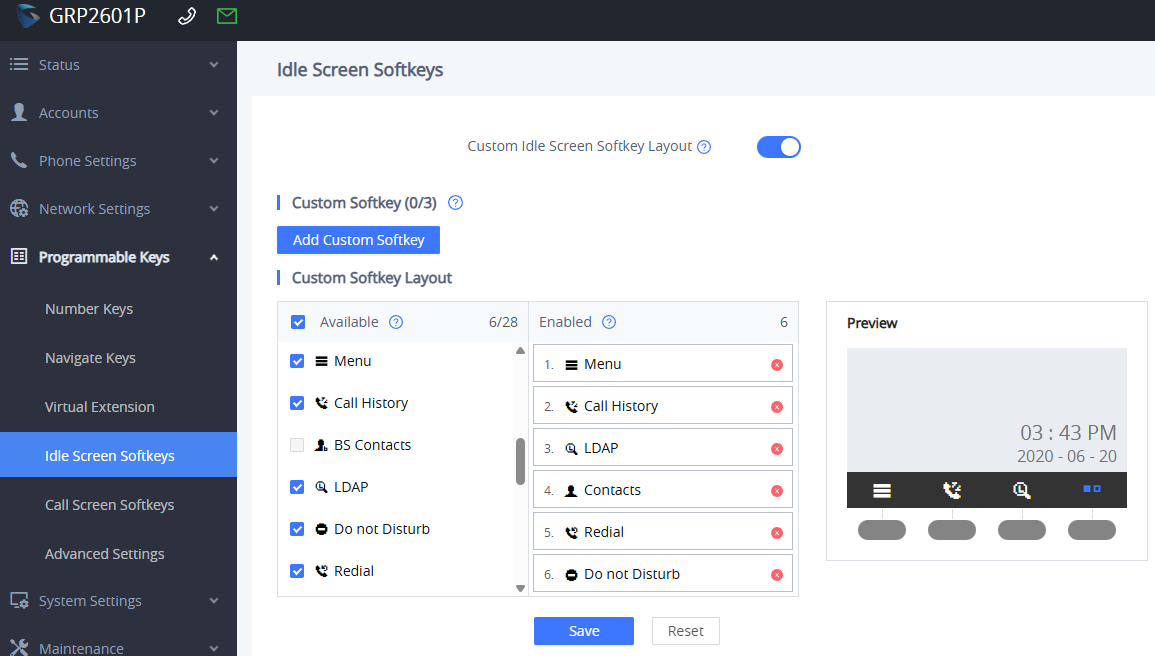 Provide the PBX URL (such as https://192.168.80.2:8089 ), username ContactsAdmin and password to the member of staff who can then follow the above instructions to administer the shared external contacts using the above instructions. Ensure that the extension user "WAVE password" has been set and conveyed to the user so that they can test the shared contacts. Tip: Add a programmable soft-key (MPK / VMPK) with blank value for action "LDAP Search" to handsets for quick access to the LDAP server phonebook. If using Grandstream phones then editing a Global Policy & Template will deploy to phones:
